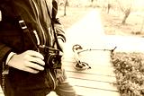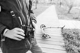 Girl or boy with a retro camera and a scooter in the garden. A child in a blue jacket with a zipper on the wooden walkway with defocused background.