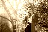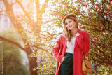 Outdoor spring fashion portrait of young beautiful happy smiling lady wearing trendy coral color coat, carrying yellow shoulder bag, posing in park with blooming trees. Copy, empty space for text