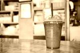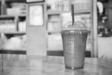 fruit frappe in transparent plastic glass and brown straw on table with blurred bookshelf