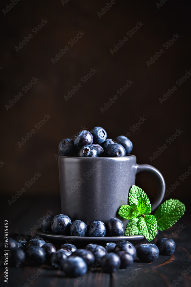 Blueberries in a Cup on a dark background. Summer and healthy food concept. Background with copy space. Selective focus. Vertical.