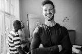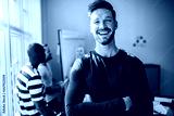Laughing young designer standing in an office after a presentati