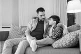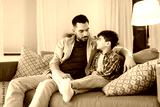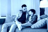 family, relationships and trust concept - father talking to his sad little son at home in evening