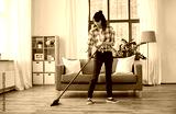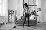 cleaning housework and housekeeping concept - happy asian woman with broom sweeping floor and dancing at home
