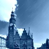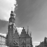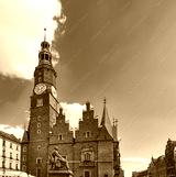 Aleksander Fredro memorial near Tower of Wroclaw Town Hall, which is located in central market square in Wroclaw, Poland