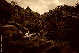 Couple standing on wooden bridge near rice terraces in Bali Indonesia. Holding hands. Romantic mood. Tropical vacation. Aerial shot. On background coconut palm trees.