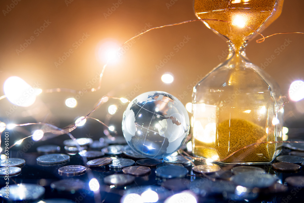 Global business investment growth. Wealth concept. Gold sand running through the shape of hourglass with world globe crystal glass, US dollar coins and illuminated Christmas lights on reflective table