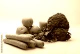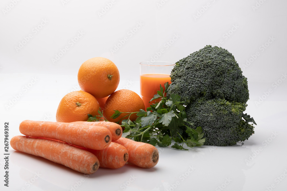 Carrots, broccoli, orange, fresh vegetables and fruits on a white background.