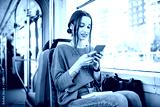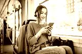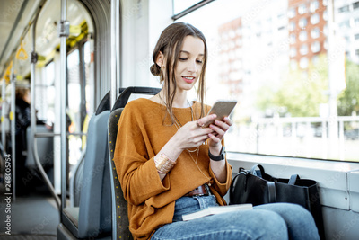 Young and happy woman using smartphone while sitting near the window in the public transport during the trip