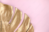 Closeup of golden monstera palm leaf on pink background. Tropical luxury minimal summer background. Flat lay. Copy space.
