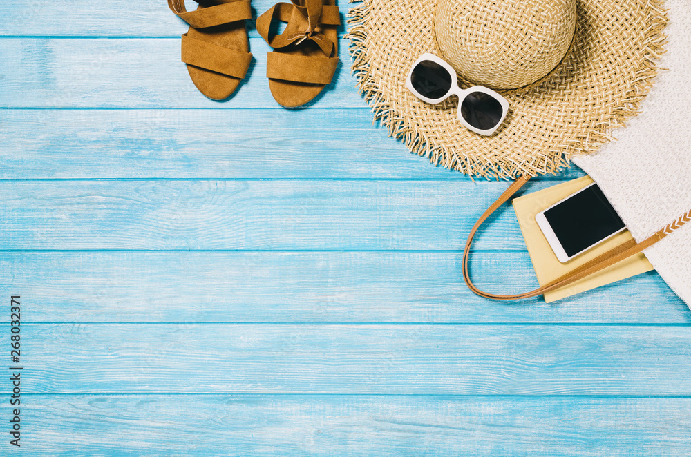 Top view of blue planks marine pier near the beach. Frame composition with summer accessories. Background with copy space and visible wood texture. Border composition