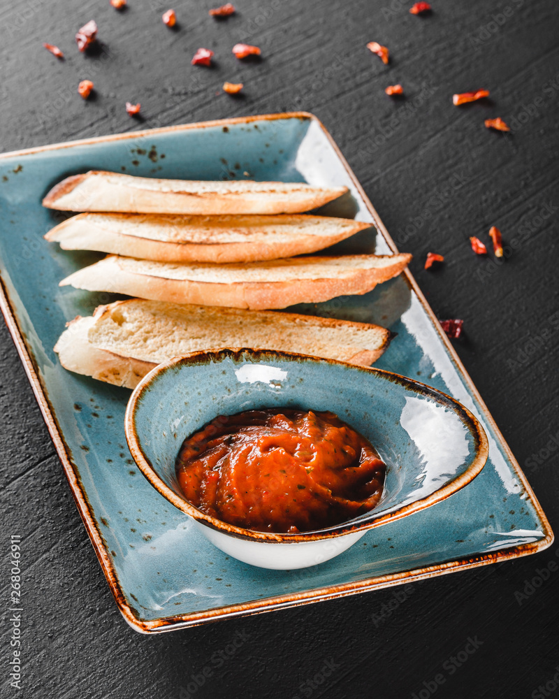 Fried Bruschetta with vegetable sauce in plate over dark background. Vegetarian food concept. Delicious snacks, crostini, antipasti. Top view