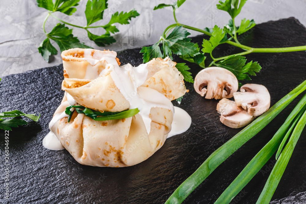Stuffed crepes topped with mushroom julienne sauce and greens in plate over dark grey stone surface. Pancake week or Shrovetide. Healthy breakfast