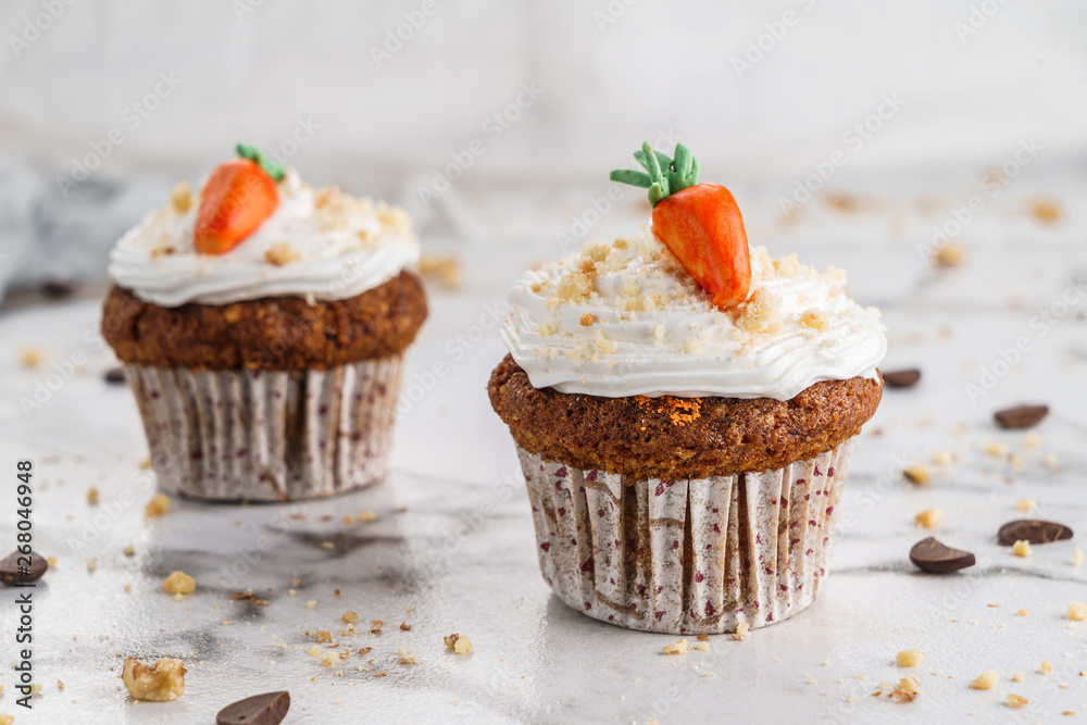 Easter cupcakes or muffins with cream and carrot candy on light marble background. Holiday cake celebration, delicious dessert, close up