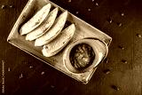 Fried Bruschetta with vegetable sauce in plate over dark background. Vegetarian food concept. Delicious snacks, crostini, antipasti. Top view