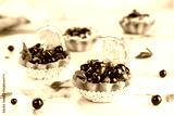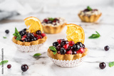 Fruit tart with orange, pomegranate, currant and cream, cakes and sweetness on light marble background. Delicious dessert and candy bar