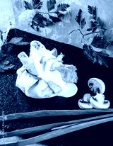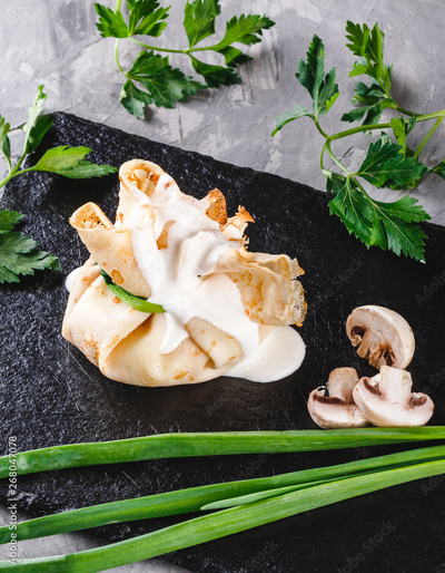 Stuffed crepes topped with mushroom julienne sauce and greens in plate over dark grey stone surface. Pancake week or Shrovetide. Healthy breakfast