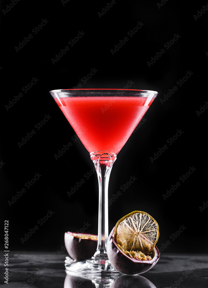 Cold red cocktail with passion fruit in tall glass on black background. Summer drinks and alcoholic cocktails