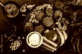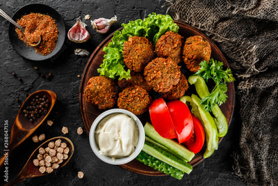 Roasted chickpeas falafel patties with garlic yogurt sauce, served with lettuce and fresh vegetables in a plate over dark stone background. Healthy vegan food, clean eating, dieting, top view