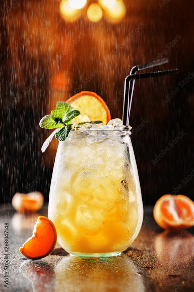 Fresh lemonade with mint, tangerines and ice in glass jar on the glass background. Backdrop of the restaurant atmosphere. Summer drinks and cocktails