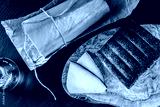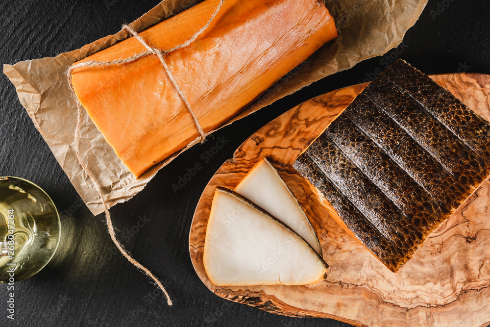 Smoked white fillet fish with spices and oil on craft paper over dark stone background. Seafood, top view.
