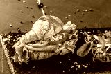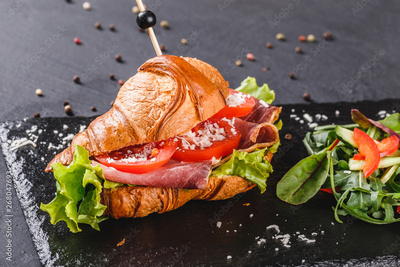 Croissant sandwich with prosciutto, tomatoes, cheese parmesan and greens on black shale board over black stone background. Healthy food concept.