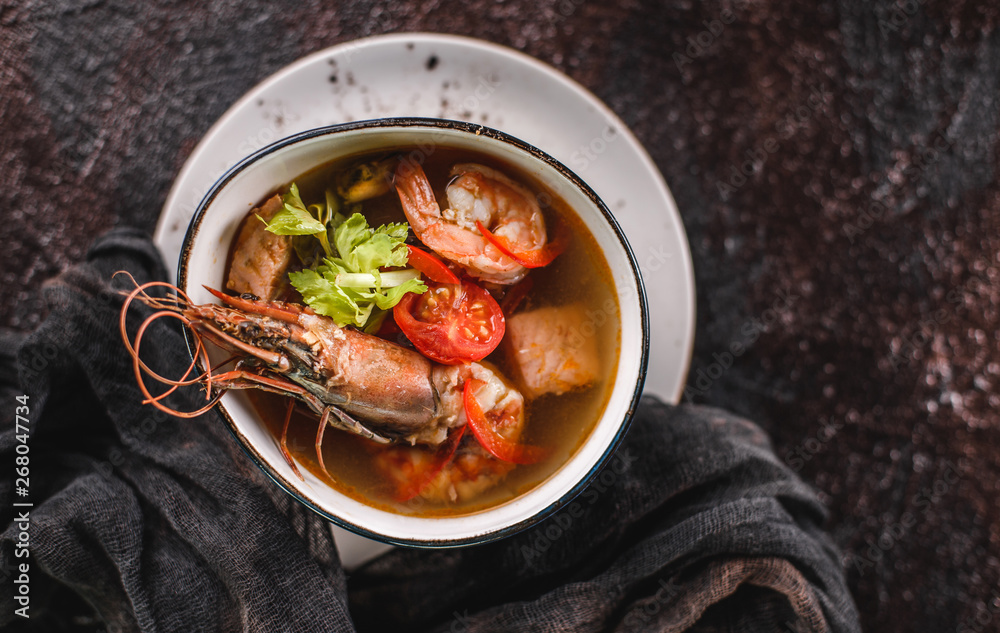 Seafood soup with langoustine, mussels, squid, fillet salmon, shrimp and celery in bowl over dark background. Healthy food, diet food, mediterranean food. Top view.