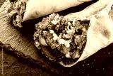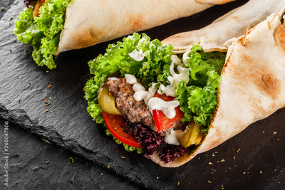 Tortilla wraps with grilled meat, fresh vegetables and salad on black stone background. Healthy snack or take-away lunch.
