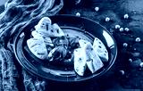 Chickpeas hummus with olive oil, paprika, pine nuts and pita bread in a ceramic plate over grey background. Healthy vegan food, clean eating, dieting, top view