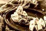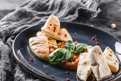 Chickpeas hummus with olive oil, paprika, pine nuts and pita bread in a ceramic plate over grey background. Healthy vegan food, clean eating, dieting, top view