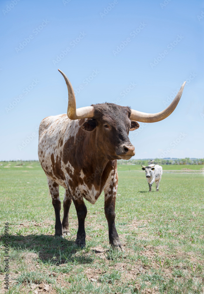 Texas longhorn bull steer cow with long horns in green pasture portrait closeup