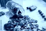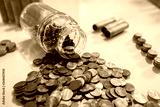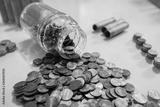 A spilled glass jar of pennies and coins from piggy bank or spare change savings.
