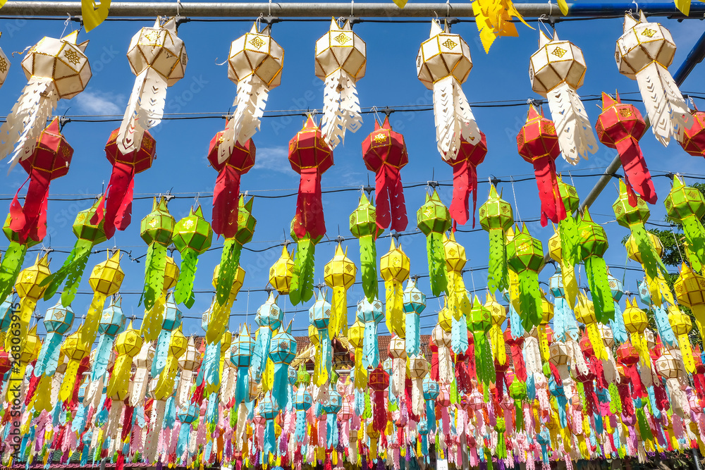 Rows of traditional paper lantern hanging on above during Yi peng (or Yee peng) festival in Wat Phra That Hariphunchai, Lamphun province, Thailand.