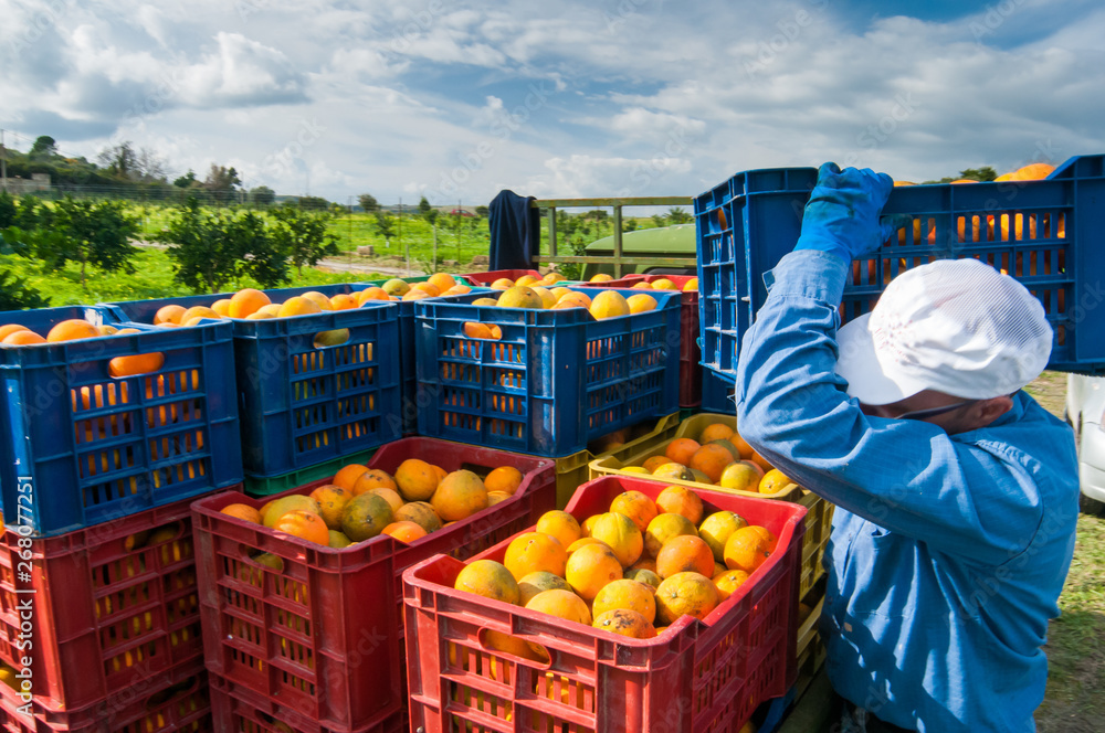 Orange harvest time: colored fruit boxes full of navel oranges in an citrus grove during harvest season in Sicily