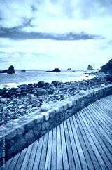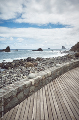 Wooden boardwalk by the Roque de Las Bodegas Beach, retro color toning applied, Tenerife, Spain.
