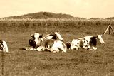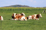 Herd of cows on beautiful rural animal farm grazing on green grass meadow.