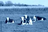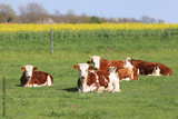 Herd of cows on beautiful rural animal farm grazing on green grass meadow.