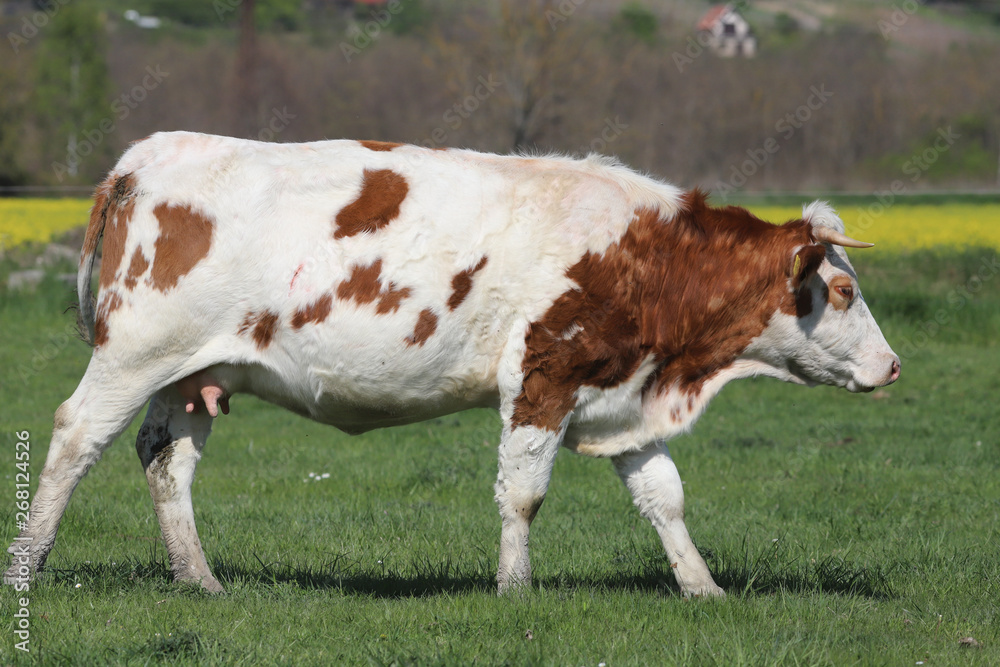 Herd of cows on beautiful rural animal farm grazing on green grass meadow