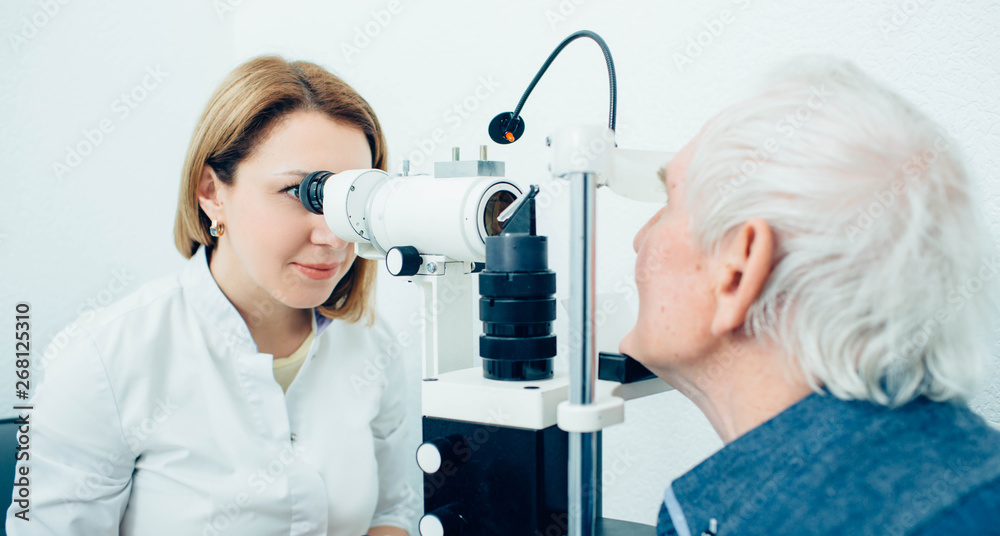 Doctor Optometrist examining old man's eyes with special eye equipment