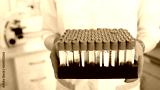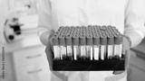Laboratory scientist holding blood samples in a test tube rack. Blood research