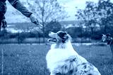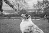 Woman and her dog doing animal obedience training. Cute Australian Shepherd