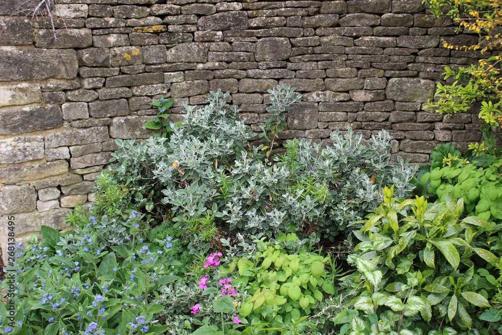 Plants and flowers in a garden border against a backdrop of a dry stone wall.