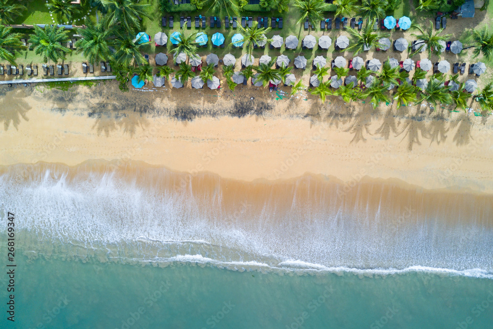 Aerial view of resort with coconut trees, umbrellas and deck chairs on the beach. Ocean wave reaching coastline. Beautiful tropical beach from top view. Andaman sea in Thailand. Summer holiday concept