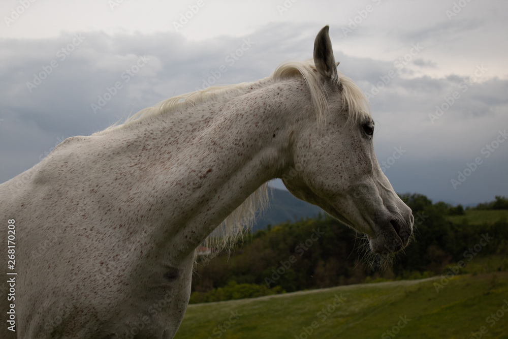 Portrait of a horse: beautiful, female, white or grey arabian horse in country house. Farm life