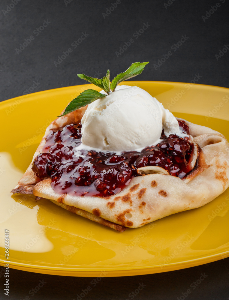 Pancakes or crepes with jam and ice cream decorated with mint on a plate over dark background. Breakfast food. Top view.