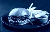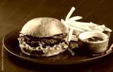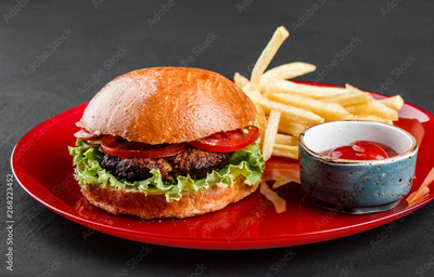 Beef burger and french fries with tomato sauce on red plate over dark background. Unhealthy food.
