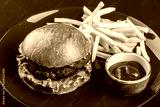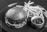 Beef burger and french fries with tomato sauce on red plate over dark background. Unhealthy food.