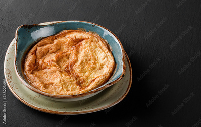 Breakfast, Omelette with vegetables and herbs on plate over black table surface. Healthy food
