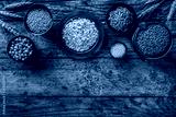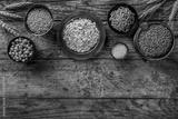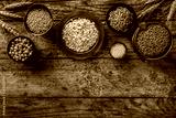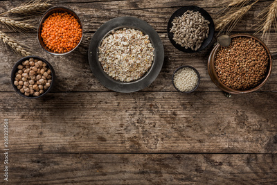 Superfoods and cereals selection in bowls, chickpeas, lentils, buckwheat, oatmeal, flax seeds, sunflower seeds on rustic wooden background. Healthy food concept, top view, flat lay, copy space