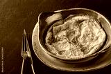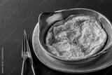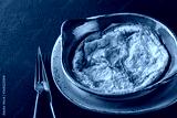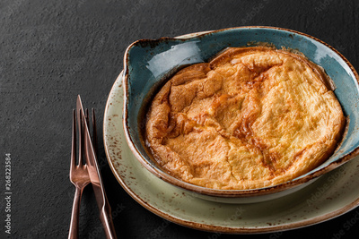 Breakfast, Omelette with vegetables and herbs on plate over black table surface. Healthy food