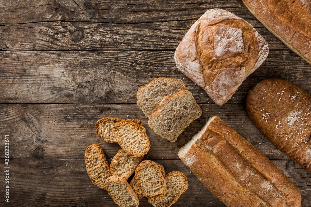 Different fresh bread and spikelets of wheat on rustic wooden background. Creative layout made of bread. Healthy food concept, top view, flat lay, copy space